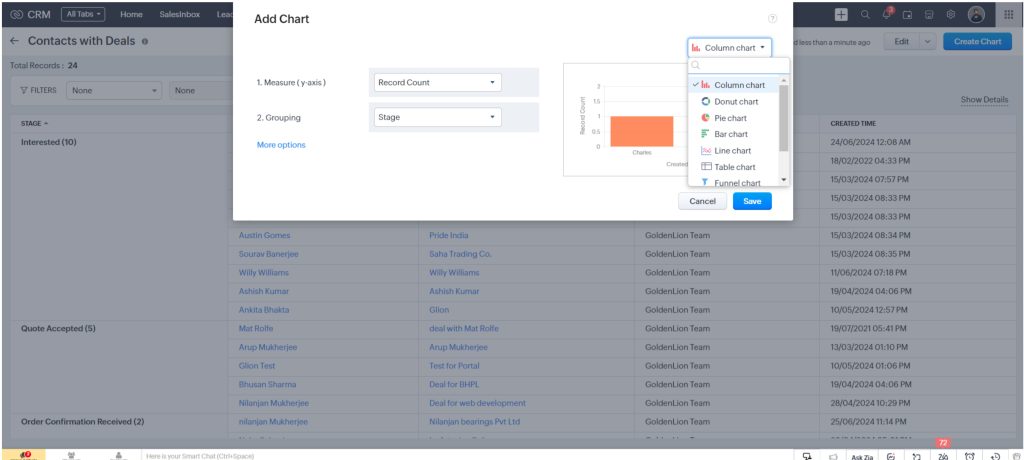 Once your report is ready you can further enhance the effectiveness of your report, by incorporating various types of charts to visually represent your data. This includes Pie charts, Bar charts, Funnel charts, and more.