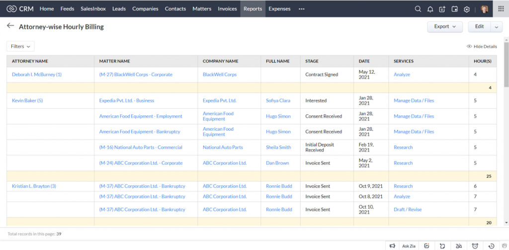 The key functionalities of Law Firm CRM have to be the reports and dashboards. These modules are the visual representations of your data making them more readable and comprehensive. You can use this dynamic duo to define and measure your KPIs, and understand the emerging marketing trends to make your strategies more effective. This is what a standard report looks like-